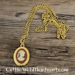 Dette vedhæng er lavet af forgyldt tin og viser portrættet af en ung kvinde. I den victorianske æra, blev det muligt masseproduktion af smykker på grund af den industrielle revolution. Smykker blev dermed tilgængelig for alle lag af samfundet. Gæsteoptrædener, små relieffer med kontrastfarver, blev meget populær i smykker design. Vedhænget er 2,3 x 1,8 cm store og leveres herunder halskæde.