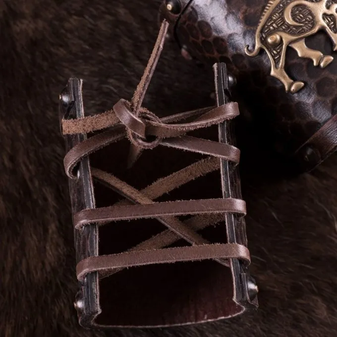 Et par smukke keltiske stil læder armbånd, til brug hver dag eller med din larp eller reenactment outfit. Disse armbånd er dekoreret med en keltisk sender, baseret på en 7. århundrede piktiske sten fra Knocknagael, Skotland. Orner er vigtige dyr i keltisk mytologi. Kødet af orner var helligt for de gamle keltere, i irsk mytologi denne kødet blev spist når der var en fest eller fest. Adskillige keltiske folk tilbad en orne gud, ligesom Moccus. Han var en gallisk gud, der beskyttede orne jægere og krigere. Armbåndene er lavet af høj kvalitet læder, med en indvendig foring af blødt ruskind for ekstra komfort. De har læder snore til fastgørelse.