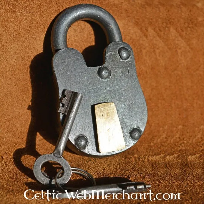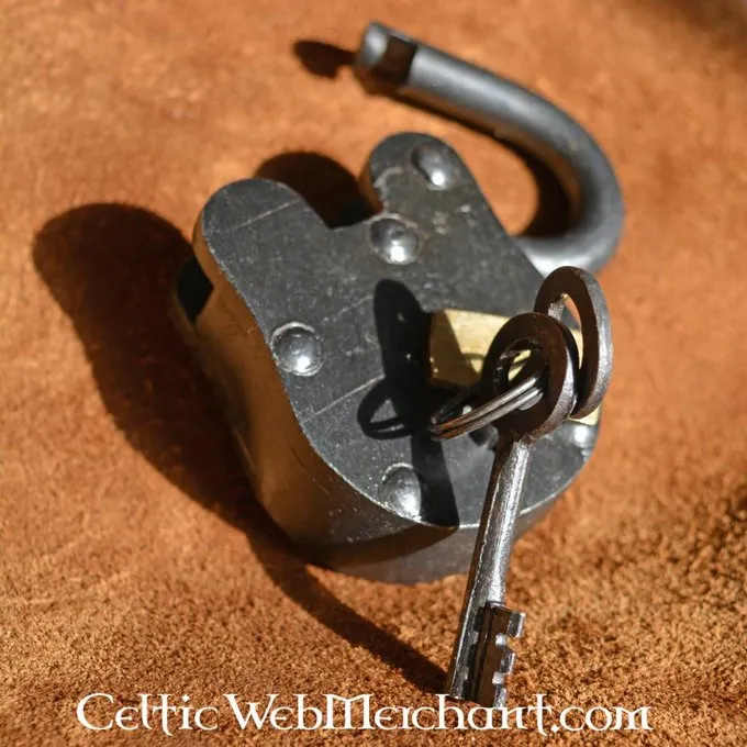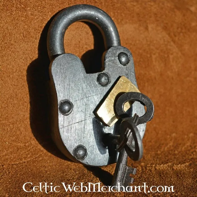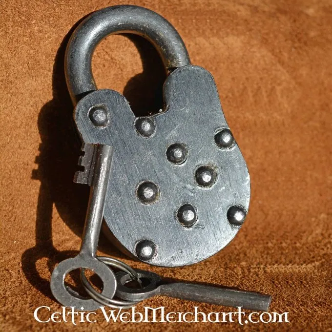 En helt nitteed stål hængelås med to nøgler. Det er ca. 9,5 cm høje og 5 cm bred.