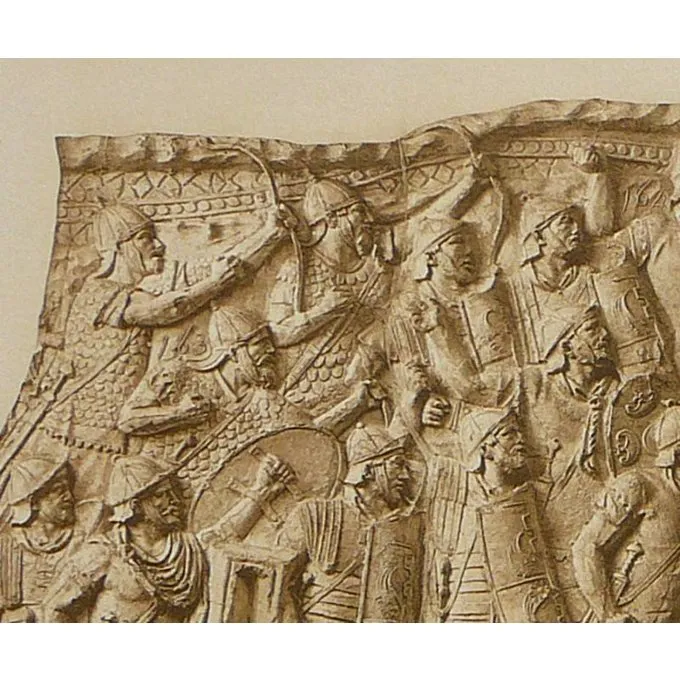 De fleste af de romerske bueskytter blev rekrutteret i den østlige, orientalske regioner. Derfor er mange grave og inskriptioner vise dem iført hjelme med østlige påvirkninger, som denne hjelm, som er meget lig den slaviske hjelm type. Denne hjelm er lavet af stål med messing dekoration og også messing kind og beskyttelse hals. Fordi møntformede plader overlapper hinanden og er syet på ruskind, det giver ekstra beskyttelse.
