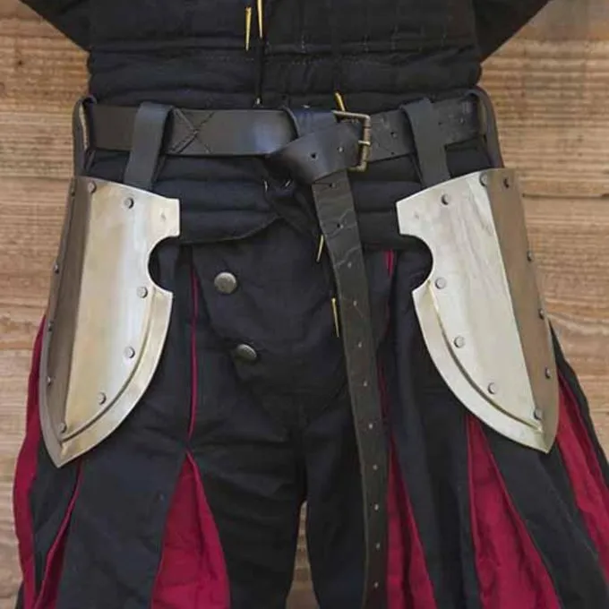 Denne rustning er designet til at beskytte lårene fra slag og stød i løbet af kampe. Den består af to skjold-formede plader, som du kan hænge i bæltet for at beskytte de ydre lår. Den rustning har robuste sorte læderremme at fastgøre dem til dit bælte. Denne rustning er derfor let at bruge og en ideel tilføjelse til dit kostume. Overfladen er dekoreret med stål nitter og har en elegant kant.