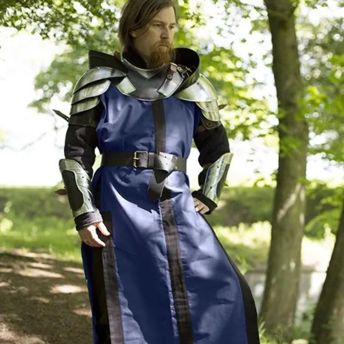 Materiale: blødt stål, læder, bomuld / / Levering omfatter: skulder rustning med Gorget, armbeskyttere i plade, grever, surcoat og bælte. / / Stål tykkelse: 1 mm / / Finish: poleret & patineret / / En størrelse passer alle /