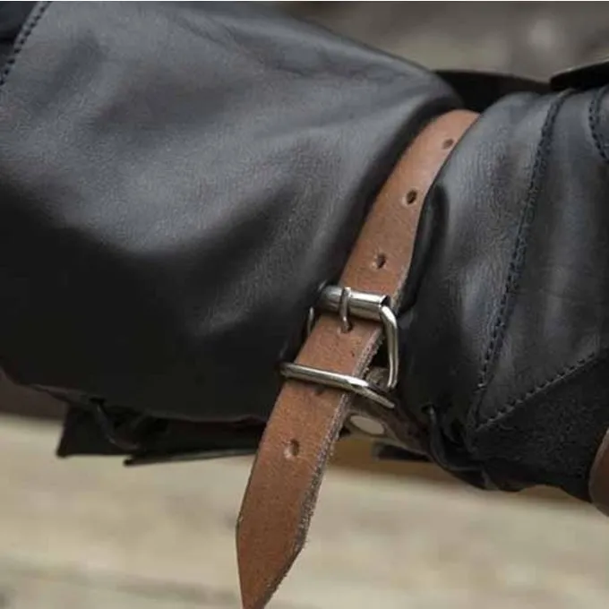 Disse demi-gauntlets dækker hånden fra knoerne til underarmen. Det er inspireret af historiske originaler og består af tre overlappende ståldele, der er fastgjort til hinanden med læderremme. Dette giver dig en optimal bevægelsesfrihed. Den rektangulære plade på håndleddet er fremstillet af 1,5 mm tykt stål. Disse demi-gauntlets leveres uden læder inderhandsker, men sagtens kan kombineres med alle handsker i vores sortiment.