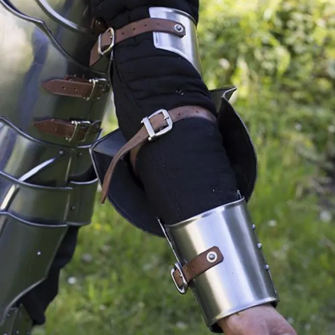 Denne rustning er inspireret af historiske stål arm beskyttelse fra den middelalderlige gotiske periode. Den består af couters designet til at beskytte albuerne, med den hævede kant til at afværge slag. De couters yderligere er forlænget med armbeskyttere i plade og en halv-rerebrace. På toppen og bunden og på albuerne kan du fastgøre rustning med læderremme. Hele panser er forstærket og dekoreret med stål nitter og hævede kanter. </ P> Denne rustning er 1 mm tyk og er egnet til larp slag, teater, Cosplay og dragter.