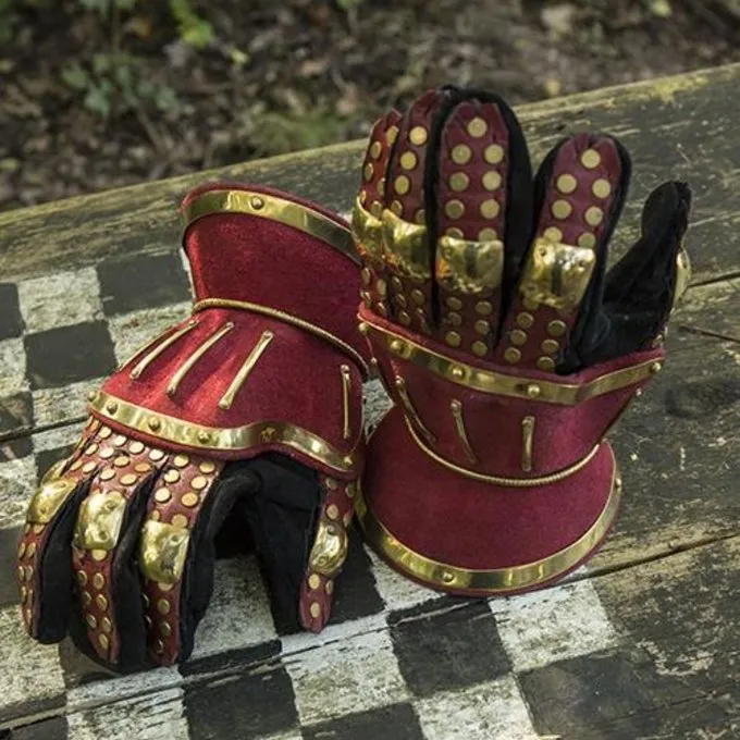 Disse gauntlets er inspireret af sene 14. århundrede originaler med en luksuriøs og farverigt twist. Stålet er dækket med smukke luksuriøse ruskind på hænderne, og på fingrene med farvet kvæg læder. Derudover er de gauntlets smukt dekoreret med messing nitter og messing beslag på knoerne og kanter. De gauntlets beskytte fingre, håndled og hænder. Theinterior er har komfortable ruskind læder indre handsker. Stålet af fingrene er syet til de indre handsker til ekstra styrke og for at undgå skader. Disse udsøgte rustning handsker er en fantastisk tilføjelse til dit kostume! Med historiske dragter kan du bruge dem til en middelalderlig kontekst, men de er selvfølgelig også dejligt for steampunk, fantasi og larp kostumer. Disse rustning handsker er 1 mm tyk og er egnet til larp slag, kostumer og Cosplay.