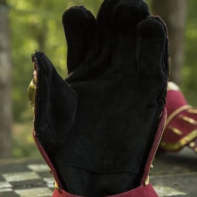 Materiale: kulstofstål (1 mm), bovint læder, ruskind, messing / / Farve: rød / / Levering: pair / / Længde: 26 cm / / Hånd bredde: 10 cm / / Længde underarm: 5 cm / / Håndled bredde: 8 cm / / Længde pegefinger: 7 cm /