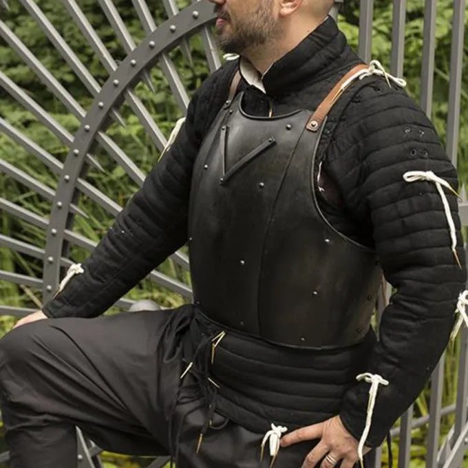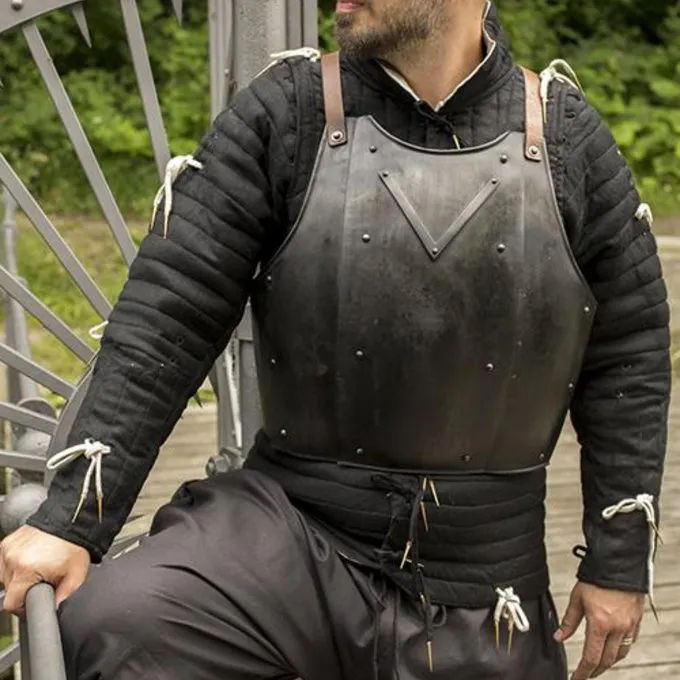 Denne brystplade er inspireret af historiske originaler. Det har nitter til ekstra styrke og et V-formet stykke på brystet. Kuras fortsætter på nedre ryg, så det beskytter både torso og underliv og nedre ryg. Med justerbare læderremme kan du fastgøre cuirassen godt og behageligt og justere det til din smag. Brystpladen når til hofterne. Den har en mørk patineret finish til en ekstra speciel effekt! Denne rustning er 1 mm tyk og passer til Larp-slag, Cosplay og teater.