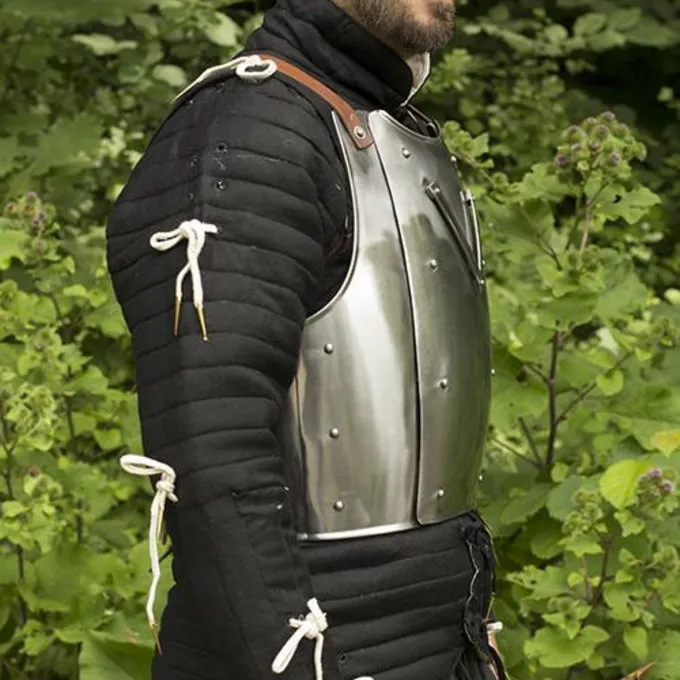 Denne brystplade er inspireret af historiske originaler. Det har nitter til ekstra styrke og et V-formet stykke på brystet. Kuras fortsætter på nedre ryg, så det beskytter både torso og underliv og nedre ryg. Med justerbare læderremme kan du fastgøre cuirassen godt og behageligt og justere det til din smag. Brystpladen når til hofterne. Denne rustning er 1 mm tyk og passer til Larp-slag, Cosplay og teater.