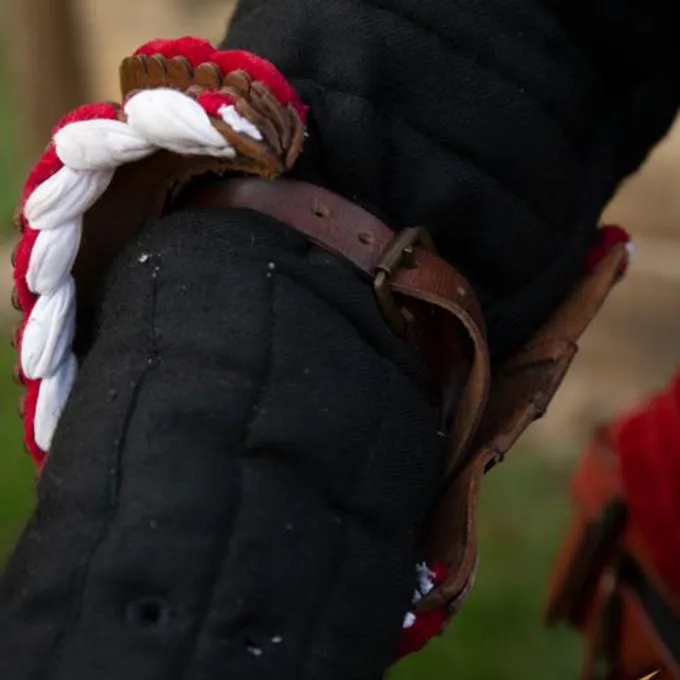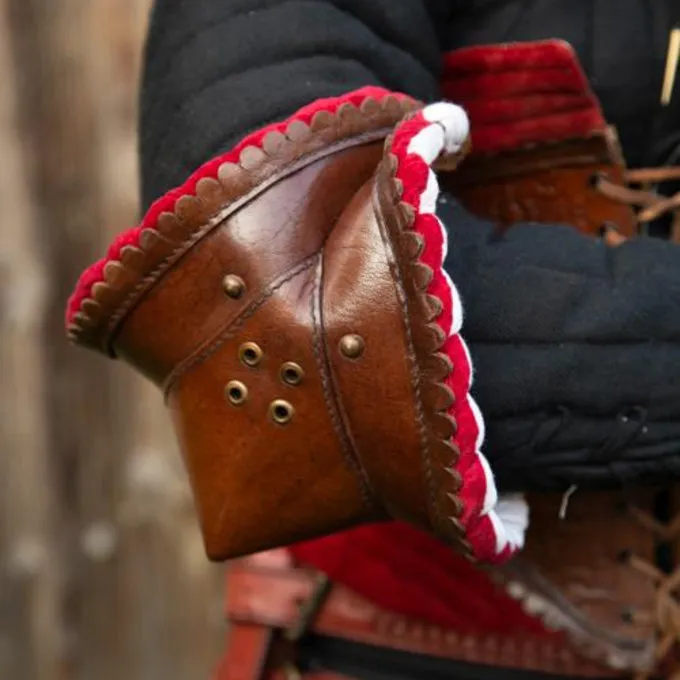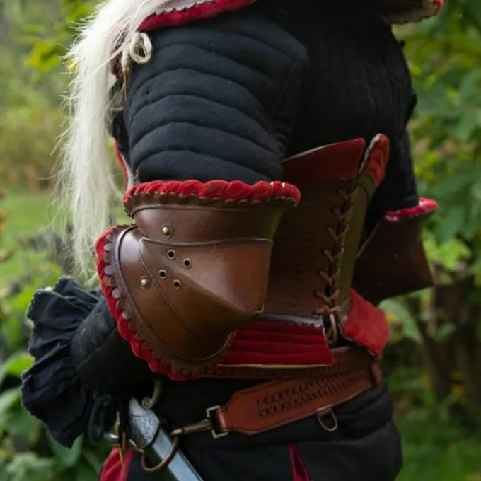 Denne smukke læder rustning beskytter albuerne i løbet af kampe. De couters leveres i par og har et smukt design, lavet af stærk brunt læder med et dekorativt mønster på siderne. De er også dekoreret med messing søm. De couters har en smuk luksus rødt fløjl foring. Med et robust læderbælte kan du fastgøre couters på indersiden af albuen. Midten af Couter har 4 øjne til at fastgøre dem endnu mere sikkert med læderremme til din Gambeson findes eller dublet.