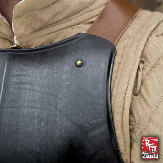 Denne brystplade er baseret på middelalderlige originaler. Dette standard design er billigt og kan kombineres med næsten alle typer rustning og bæres over forskellige typer kostumer. Dette cuirass beskytter torso og underliv. Brystpladen strækker sig til hofterne og har et hævet center for æstetik og forstærkning. Hele har hævet kanter og er udstyret med nitter. Du kan fastgøre den med stærke læderremme af høj kvalitet. Dette cuirass er patineret for en ekstra autentisk effekt. Denne rustning er 1 mm tyk og passer til Larp-slag, Cosplay og teater.