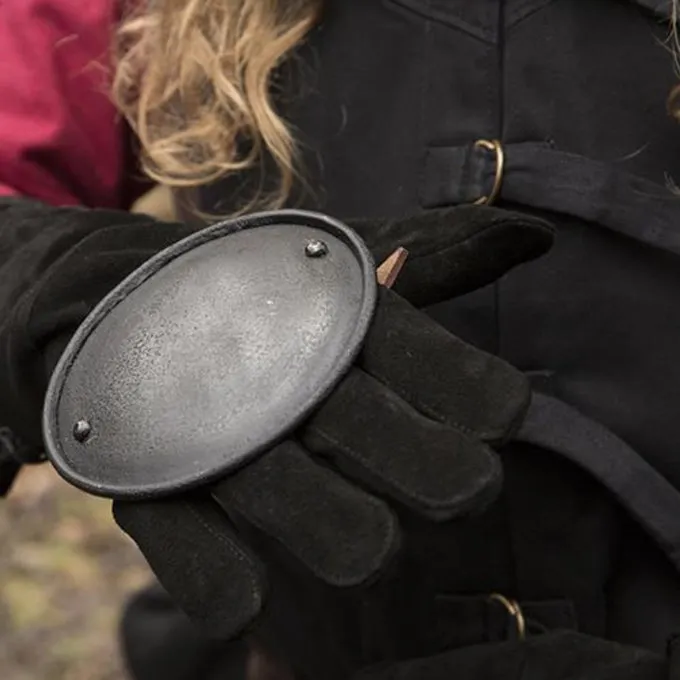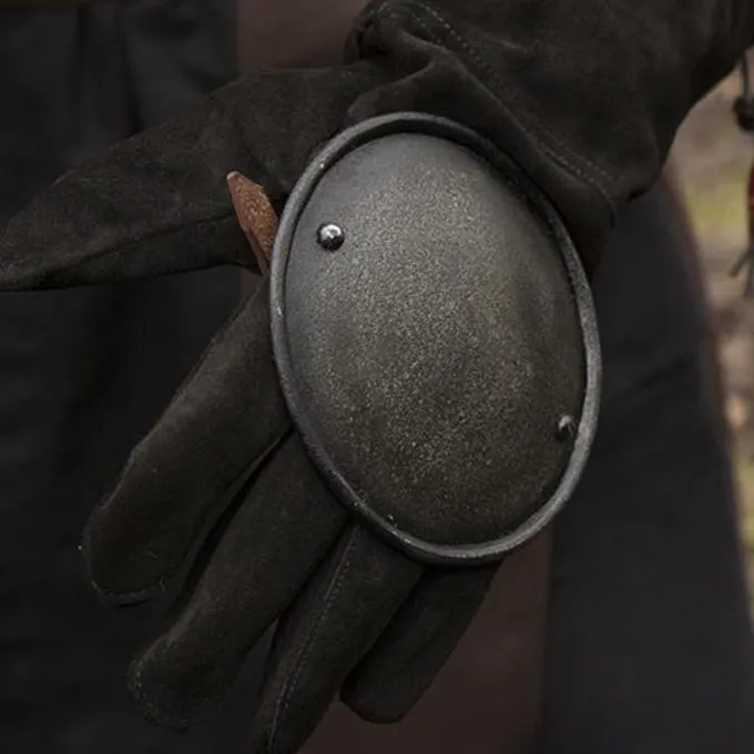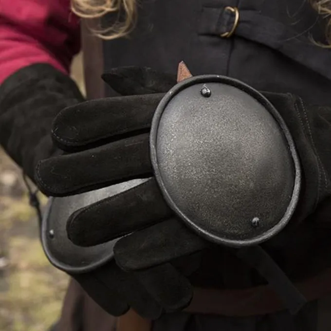 Disse roundels er baseret på de historiske roundels, som blev brugt til at beskytte følsomme kropsdele og styrke plade rustning dele. De var for eksempel anvendes til beskyttelse af armhulerne. Historisk set roundels på hånden var meget sjældne, disse blev integreret i gauntlets og blev ikke slidt separat. Dette er et perfekt tilbehør til dit kostume. Du kan vedhæfte rondel med en læderrem på hånden over en læder handske, remmen er for lille til at fastgøre det over en en spidsrod. Den særlige patineret sort finish giver en ekstraordinær effekt. Denne rustning er 1 mm tyk og er egnet til larp slag, kostumer og Cosplay.