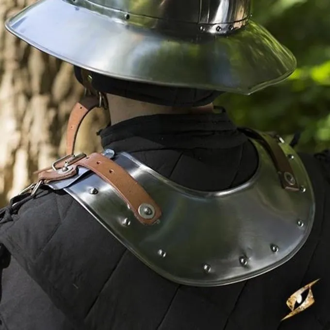 Denne gorget er lavet efter sene medieval / renæssance originaler. Det beskytter nakken og ryggen og har nitter til forstærkning. Forsiden og bagsiden kan fastgøres til hinanden med robuste læderremme. Med stropperne på siden kan du vedhæfte hylstre eller anden rustning til halspladen. Denne rustning er 1 mm tyk og passer til kostumer, LARP-slag, teater og Cosplay.