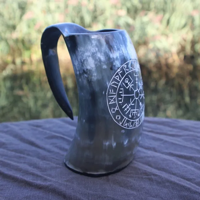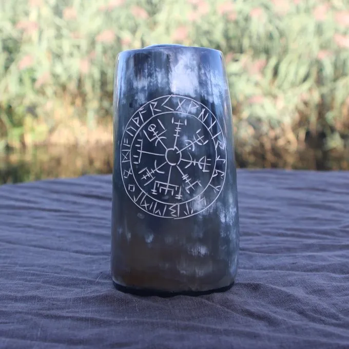 Denne Viking horn kop er lavet af smukke, glatte poleret mørk horn og er dekoreret med en islandsk Vegvisir. Den Vegvisir er et symbol fra den islandske Huld manuskript, en 19. århundrede okkult bog af magi. Vegvisir betyder: at der viser vejen. Hvem havde denne magiske symbol ville ikke gå tabt under en storm. Det vides ikke, om de tidlige middelalder Vikingerne var bekendt med dette symbol. Men i moderne viking kultur og for neopagans det er et væsentligt symbol og har fået en ny moderne kontekst. Dette bæger er ideel til reenactment og larp arrangementer, til festivaler eller slapper af derhjemme på sofaen. Dette bæger har en kapacitet på 0,5 liter, så det præcist passer til en stor flaske øl! Det er officielt blevet godkendt til indtagelse af kolde drikke, så det er også velegnet til restaurationsbranchen og restauranter. Dette horn drikkebæger har Øre til at holde det eller hænge den til et bælte holder.