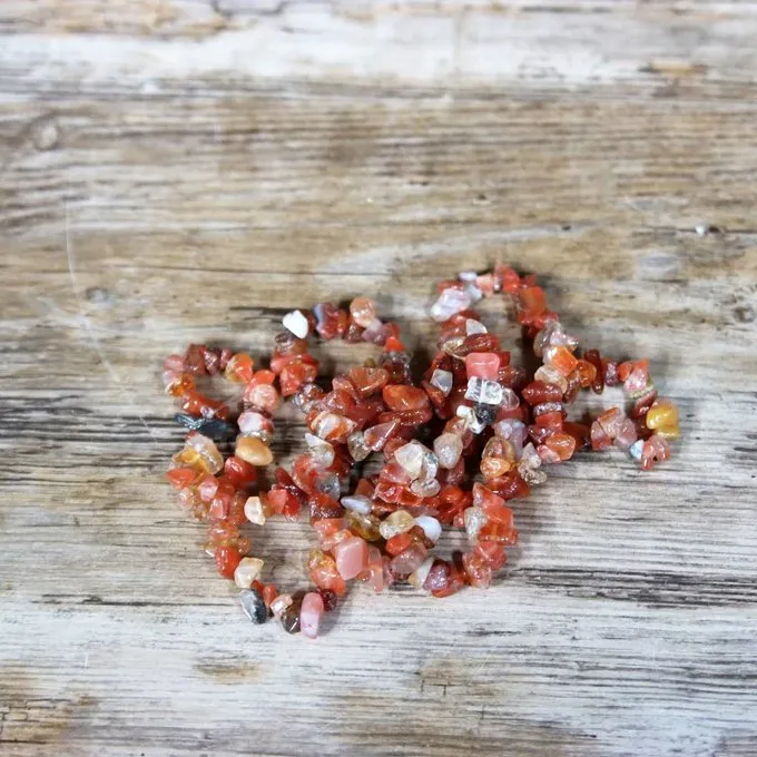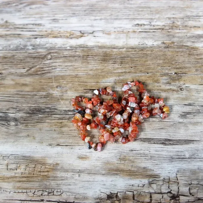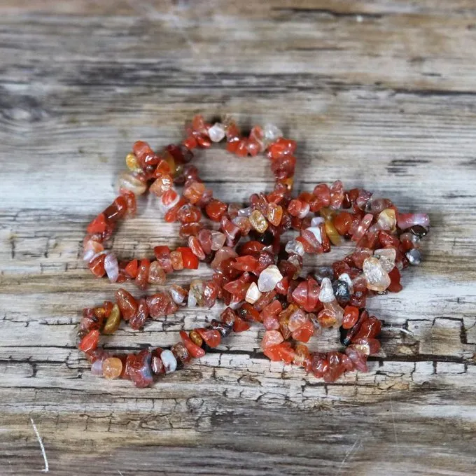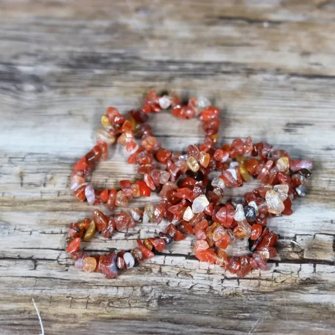 Denne halskæde består af små stykker af karneol. Carnelian har været brugt i årtusinder til at lave smykker, og det er en naturlig kvarts. På grund af den lave pris på karneol men den luksuriøse ser det kan bruges som en semi-ædle sten af historiske rekonstruktions i stedet for den dyrere rav. Iført karneol ville bringe bæreren succes, hjælper mod depression, skændes og giver motivation og selvtillid.