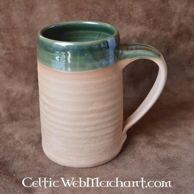 Denne øl krus har en 0,5L volumen og er lavet i den traditionelle middelalderlige måde. Denne greenware keramik er rekonstrueret i samarbejde med arkæologiske institutter.
