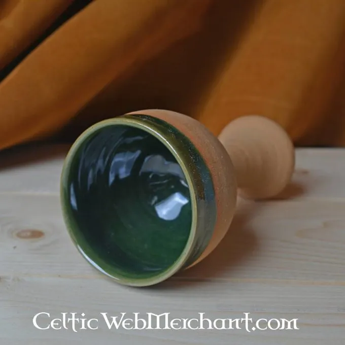 En keramisk vin bæger lavet af orchery ler med en grøn glaseret kant. Det er traditionelt lavet og opvarmes til en temperatur på 1.200 ° C. Det er 16 cm høj med en diameter på ca.. 9 cm