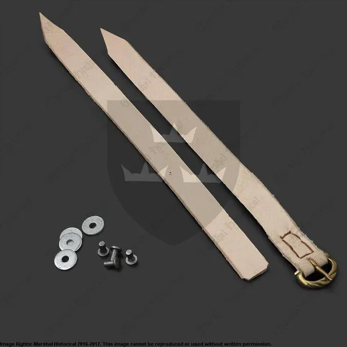 Disse handy bælter kan bruges til at erstatte bælter på rustning. De leveres herunder nitter og skiver, der gør dem nemme at knytte til rustning. Remmene har en messing replika spænde. Sættet indeholder: 1 bælte med spænde, 1 enkelt bælte, 4 nitter og underlagsskiver