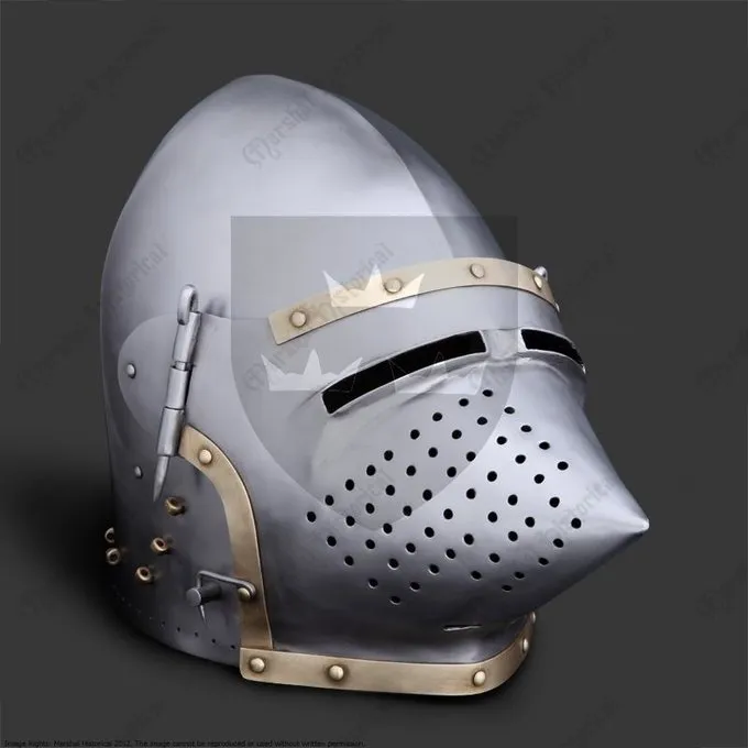 Denne kampklare Modellen er lavet af 2 mm stål og har en tekstil hjelm indlæg. Visiret, som er fastgjort med nåle, kan åbnes for en optimal område udsigt. Grisen-faced bascinet har lufthuller på kun den ene side, ligesom original. Det er dekoreret med messing strimler. Den nedre kant har vervelles, til som en Aventail kan fastgøres. Denne bascinet er lavet til re-enactment.