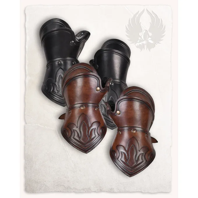 Disse gauntlets er egnede til reenactment, cosplay og larp. Produktet er lavet af læder af høj kvalitet. Gauntlets har en tommelfinger og en håndsløjfe. Handskerne har også en rem på håndleddet, så du kan justere pasformen. Handskerne er dekoreret med ornamenter, de gør en rigtig øjenfanger.