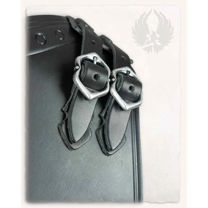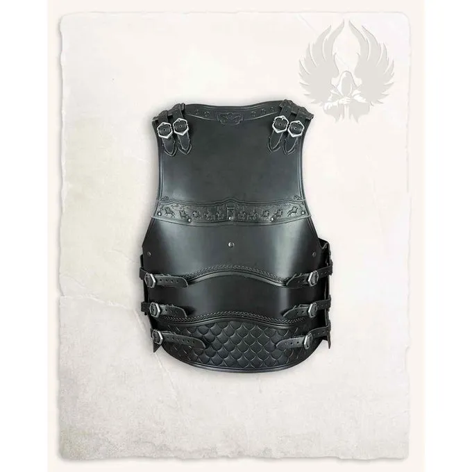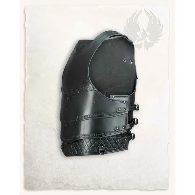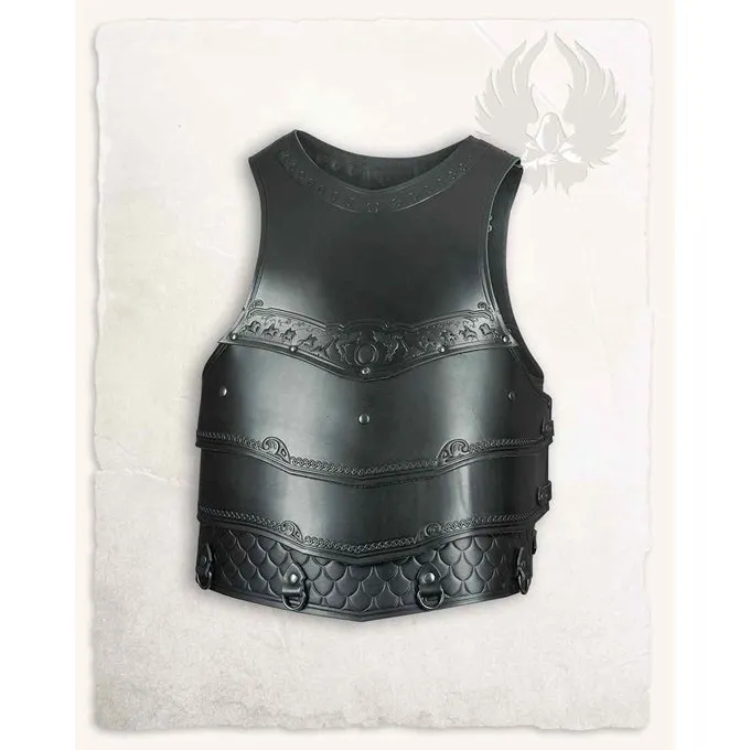 Denne rustning er velegnet til genindførelse, cosplay og larp. Rustningen er lavet af øvre læder. Rustningen kan lukkes med de seks bælte spænder. Dette giver rustningen en perfekt pasform, der giver bæreren en masse bevægelsesfrihed. Denne rustning er meget detaljeret, der er depicioner af riddere og dekorative striber. Dette gjorde det til en rigtig iøjnefaldende!