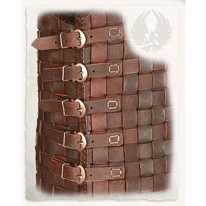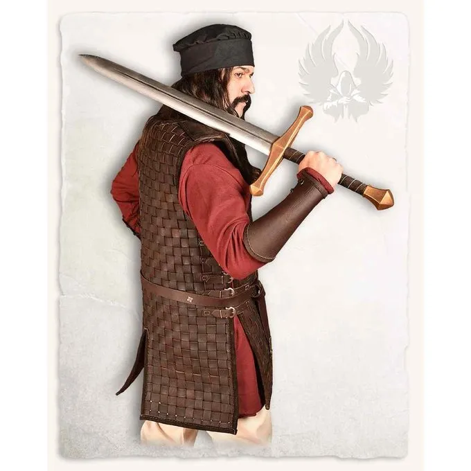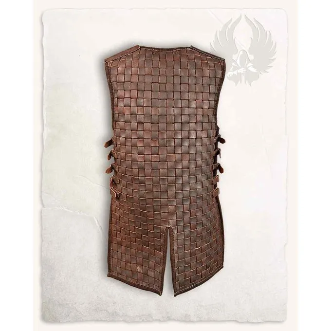 Denne rustning er velegnet til genindførelse, cosplay og larp. Dette produkt er lavet af øvre læder. Rustningen er lavet af flettede læderstrimler. Der er fem bæltespænder på hver side af rustningen. Disse sikrer, at pasningen kan tilpasses optimalt til pasningen af dens bærer. Fordi rustningen har et snit på både ryg og front, får bæreren ekstra bevægelsesfrihed. Selve designet af denne rustning giver bæreren et autentisk og robust look.