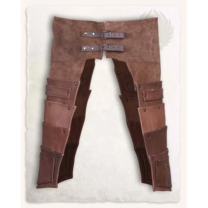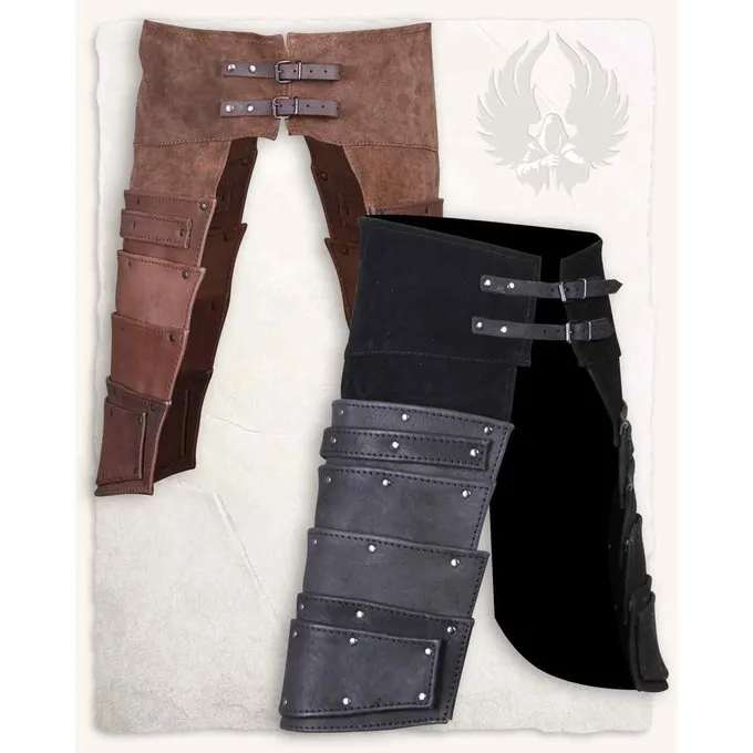 Dette produkt er velegnet til genindførelse, LARP og cosplay. Disse kvaster er lavet af øvre læder og ruskind. Du kan lukke denne rustning med to stropper, hvilket gør den ekstra robust. Designet af disse kvaster gør det meget fleksibelt, og det kurver pænt omkring bærerens hofter.