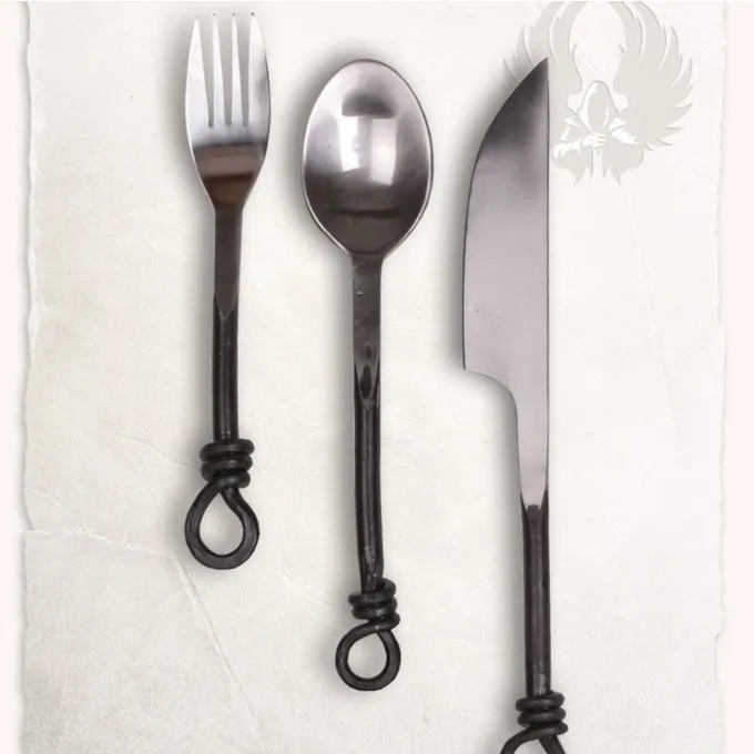 Et smukt sæt af middelalderlige bestik af Mytholon. Dette sæt består af en kniv, ske og gaffel og er lavet af rustfrit stål. Enderne har ringe, så du kan binde dem sammen med en snor eller hænge dem på dit bælte. På den måde har du altid dem ved hånden. Dette bestik er ideelt til middelalderen og renæssancen reenactment, for LARP, middelalderlige banketter, museer og film.
