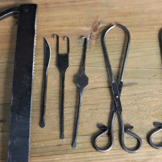Materiale: smedejern / Saw: 31 x 16 cm / Saks: 20 x 3/7 cm / Dobbeltkrog: 25 x 2,5 cm / Enkelt krog: 25 x 2,5 cm / Sårklemme: 21 x 4,5 / 6 cm / Skalpel: 17 cm / Baseret på en historisk original