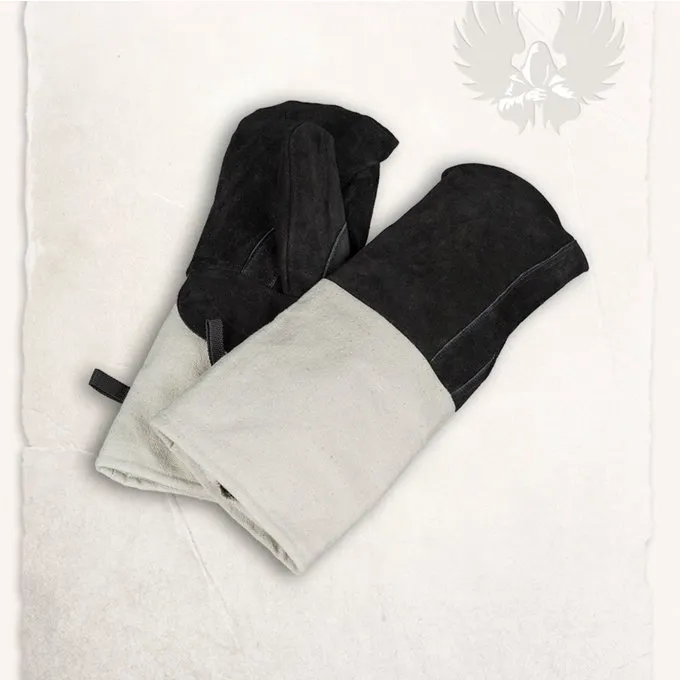 Madlavning på en åben ild er en stor hobby, men ikke uden risici. Hvis du ikke beskytter dine hænder, du kunne få brændt fra den varme stål eller selve branden. Disse handsker ved Mytholon er en fantastisk løsning! De fleste køkken handsker og ovn luffer er lavet i en moderne stil og er ikke egnet til din LARP eller reenactment karakter. Med disse middelalderlige køkken handsker kan du lave mad i stil under larp og reenactment arrangementer. De er lavet af ruskind med en bomuld manchet. Den ruskind del beskytter din hånd mod flammer og varme. Den robuste bomuld beskytter underarmene mod damp og varme gnister. De ideelle handsker til den middelalderlige køkken, madlavning over åben ild i haven, og i løbet af begivenheder.