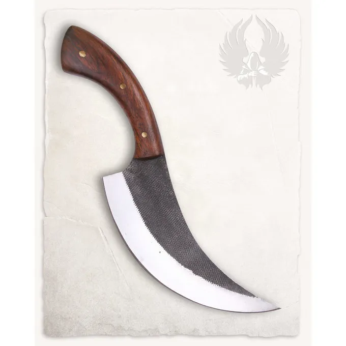 En fantastisk urt kniv ved Mytholon. Når du ønsker at lave mad historiske og middelalderlige opskrifter, er det vigtigt at bruge urter i skålene. Denne middelalderlige urt kniv er perfekt til at skære urter. Ideel til reenactment og larp begivenheder, og for Viking og middelalder reenactment. Også et uundværligt værktøj, hvis du ønsker at eksperimentere med den middelalderlige køkken derhjemme. En dejlig kniv til museer og film, der ønsker at vise en historisk køkken. Kniven er knivskarp og skærer gennem urter i stedet for at hakke dem, bevare smagen og juice. Kniven har en patineret antik finish.