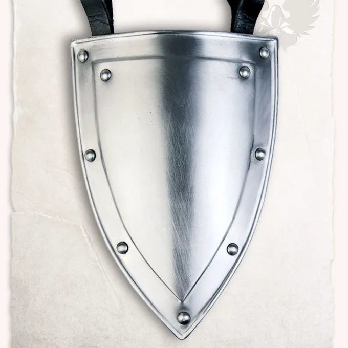 Dette bælte skjold kan males i farverne på din larp eller reenactment gruppe. Dette skjold kan sættes på bæltet for at vise du er en del af en gruppe. Dette skjold er dekoreret med nitter på kanterne. De er designet, så du kan give frie tøjler til din kreativitet. Dette bælte skjold har læder bæltestropper på bagsiden.