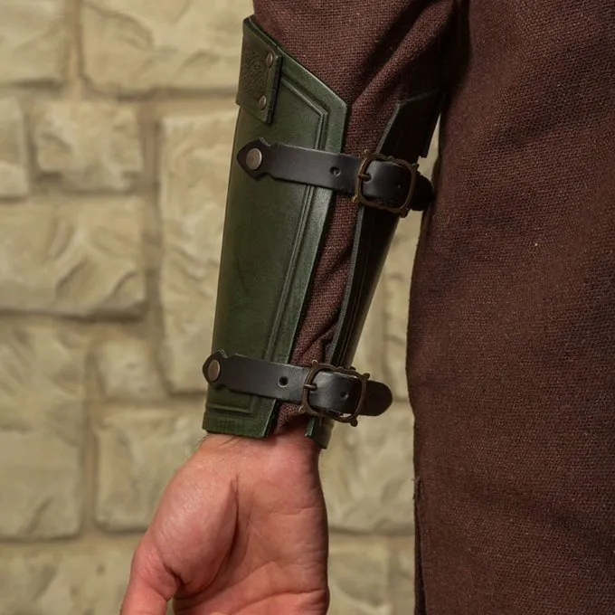 Disse Vambraces er egnede til reenactment, cosplay og larp. De er lavet af læder. VAMBRACES er dekoreret på toppen på en sådan måde, at det ser ud som om de har en hamret finish. Den nederste del er trykt med et dekorativt mønster. Vambraces kan lukkes med de to bælte spænder på bagsiden.