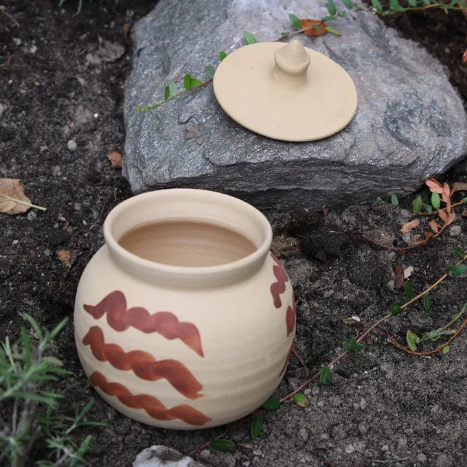 Materiale: ler / Håndlavede & håndværksmæssige / Volumen: ca.. 0,4 l / Længde: ca. 12 cm / Bredde: ca. 10 cm / Baseret på en historisk original