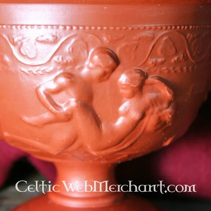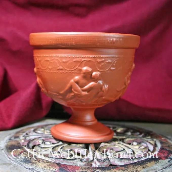 Dette bæger er lavet af rødt lertøj. Det er dekoreret med erotiske relieffer. Det har en højde på 13 cm og en diameter på 15 cm. Dette bæger er helt håndgjort ved hjælp af den autentiske metode