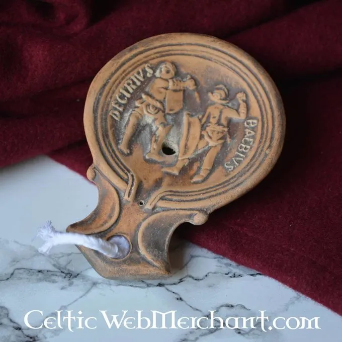 Denne olielampe er en kopi af et stykke fra den 1.-2. århundrede. Det viser en gladiator kamp, de gladiatorer navne er Decirius og Baebius. Gladiators var den klassiske filmstjerner og prof fodboldspillere, med en fanskare og enorm støtte. Sådanne lamper blev primært anvendt mellem 1. og 2. årh. E.Kr. Olielamper var den vigtigste kilde til kunstigt lys i den tid af den romerske imperium og afterwads.