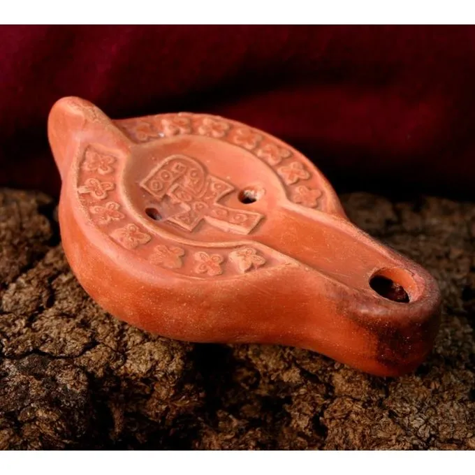 Denne olielampe er en kopi af en original fra den anden halvdel af det 3. årh. E.Kr. Omkring dette tidspunkt blev mange olielamper produceret i de afrikanske provinser i det romerske imperium. Denne olielampe er et tegn på en spirende ny religion, kristendommen. Det er dekoreret med en Chi-Rho kors. Den oprindelige blev fundet i det nordlige Italien, men lignende lamper blev brugt i hele romerske imperium.