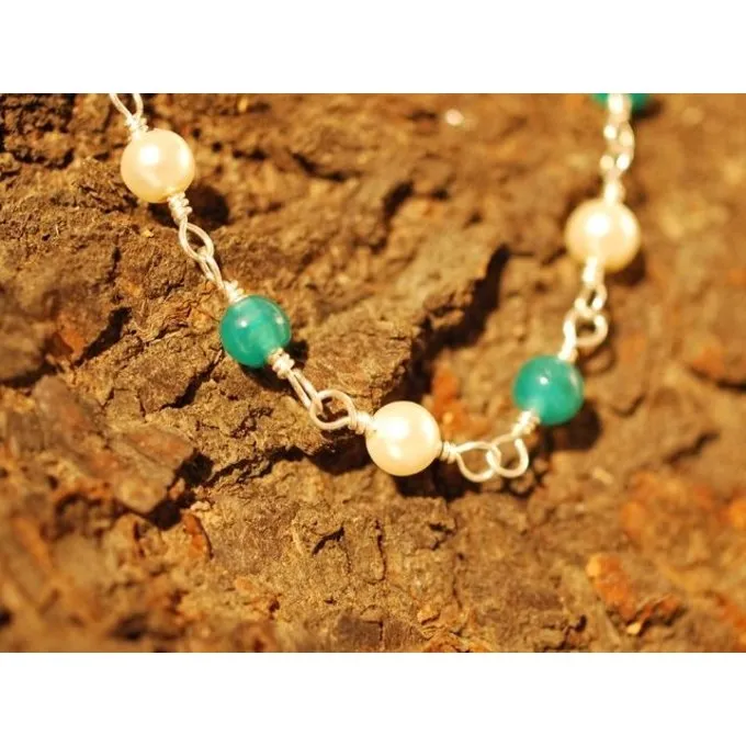 halskæde består af skiftevis turkis glasperler og ferskvandsperler. Halskæden selv er lavet af sterlingsølv.