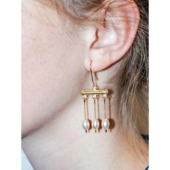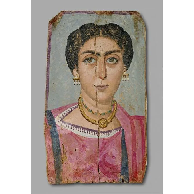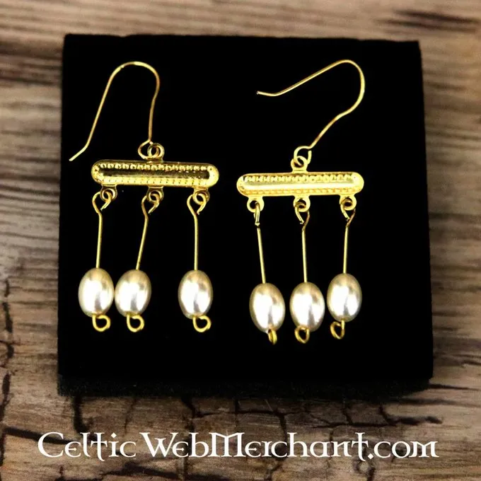 Disse øreringe er en replika baseret på dem, der er afbildet på en mumie portræt fra Er-Rubayat, Egypten, fra 300-310 e.Kr.. Portrættet er nu i Kunsthistorisches Museum i Wien. Øreringene er lavet af forgyldt tråd og kunstige perler.