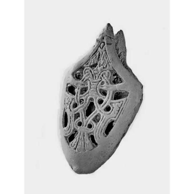 Denne skorpe ende er baseret på en original fra det 10. århundrede udgravet i Valleberga, Sverige. Enden er lavet i Borre-stil, og det skildrer et fuglemotiv. Det kan nemt fastgøres til urenheden.
