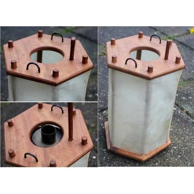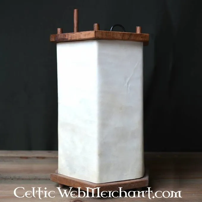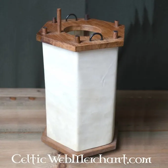 Denne lanterne er lavet efter flere tidlige middelalder originaler. Den består af en træramme med vinduer af råhud hvorigennem lyset skinner. Lanterner blev ofte brugt på grund af brandsikkerhed.
