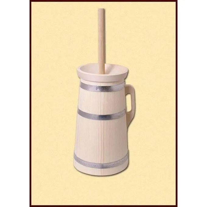 Har du altid ønsket at kværne dit eget smør? Dette er din chance! Denne smør tønde er lavet af massivt gran træ og har tre små hoops af bandet stål. Låget kan fjernes.